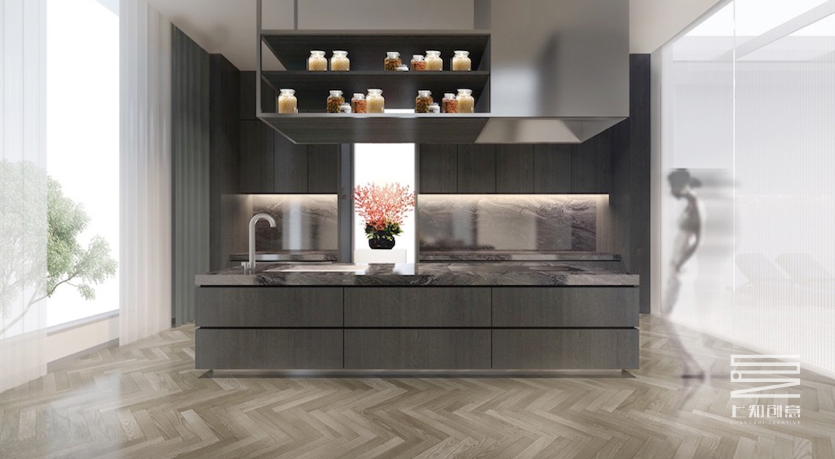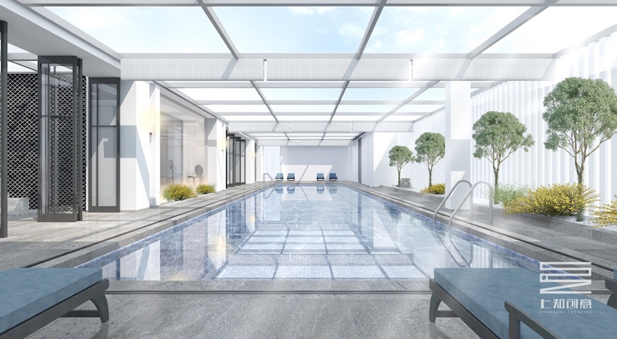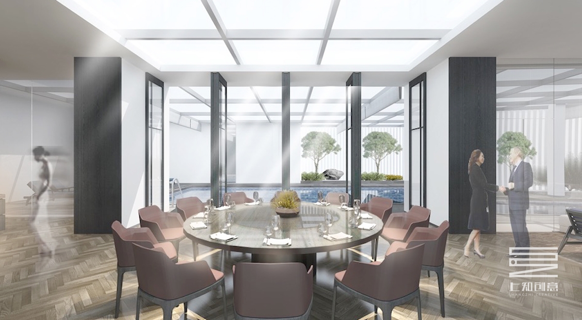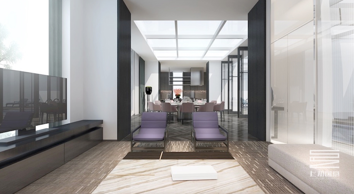 設計說明:通過簡潔的線條,以黑白灰為作為空間的主色調,搭配紫色,橙色為跳躍色的現代設計手法,主要材料有灰色地毯,人字拼木地板,通透的玻璃隔斷,黑色木制隔柵。另頂層的游泳池,輔以古樸的瓦礫墻,搭配綠植,既生動又美觀。