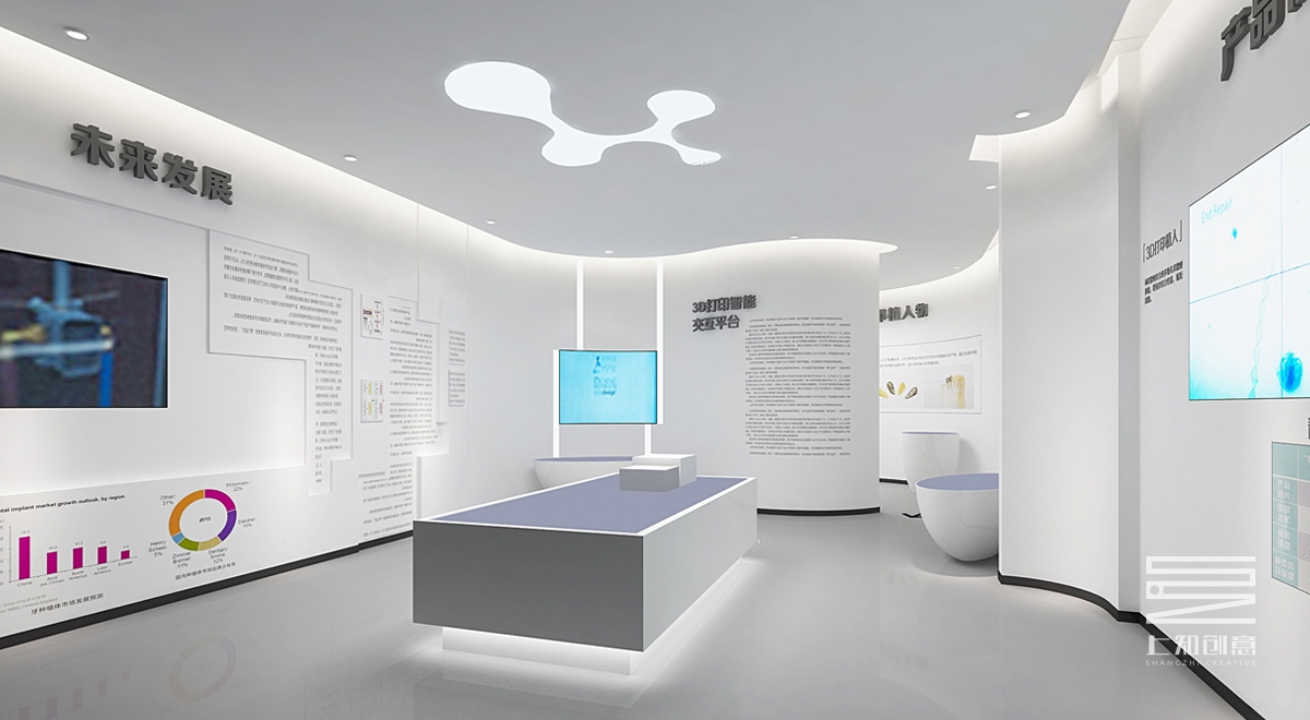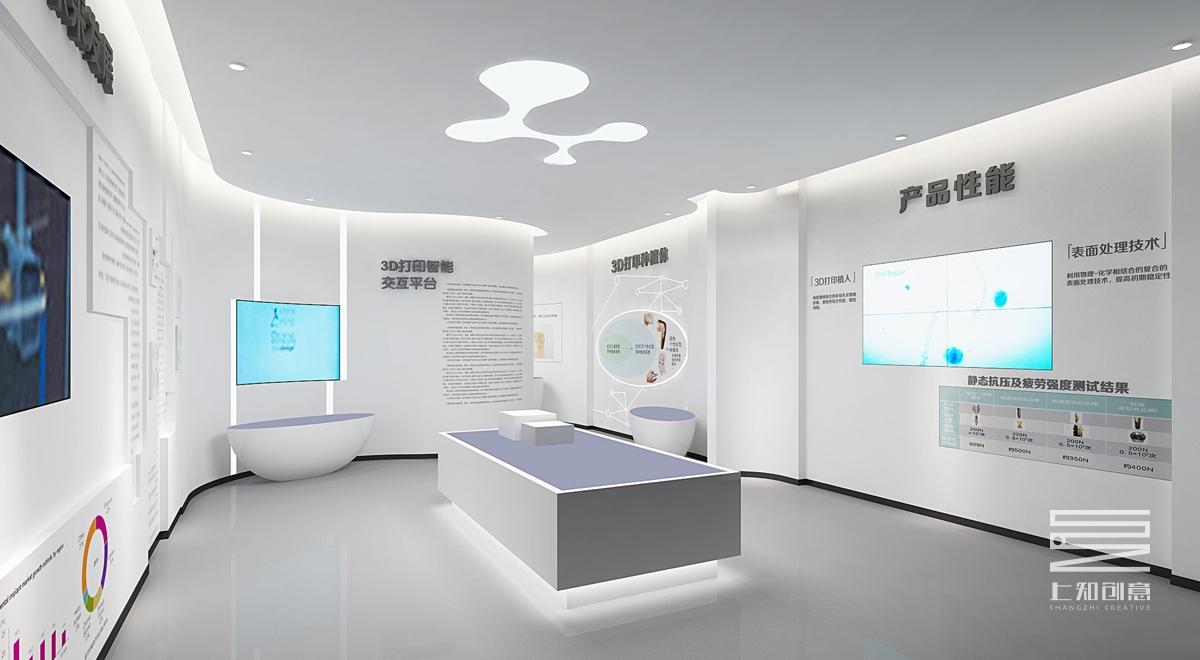 本方案以體驗高新科技感為主要設(shè)計概念,安齒生物科技展廳運用了大量空間留白以及燈光效果,體現(xiàn)了安齒高新科技感以及健康、衛(wèi)生等產(chǎn)品特性,流